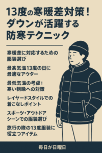 この記事では、最高気温13度の日に快適に過ごすための服装や、ダウンを使った防寒テクニックを紹介しました。寒暖差のある時期でも、重ね着や色選びを工夫すれば、おしゃれと快適さを両立できます。